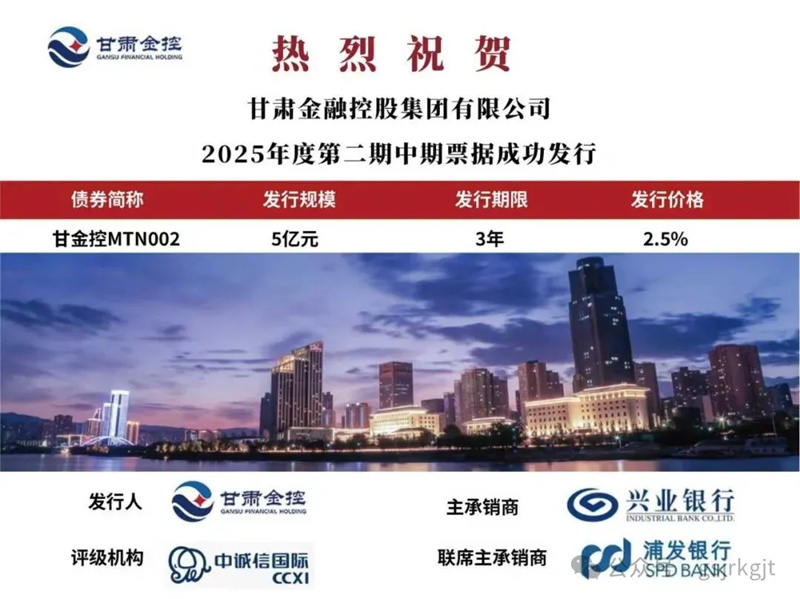 2025年10月17日,甘肃金控集团成功发行2025年度第二期中期票据。发行规模5亿元,期限3年,票面利率2.5%。票据发行过程中,吸引了多家商业银行、信托公司等机构投资者积极参与,充分体现了资本市场对甘肃金控集团综合实力、战略布局和发展前景的认可,本次中期票据发行成功为集团的持续发展提供有力的资金保障。
